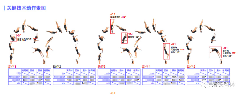 值得一提的是,小清AI蹦床训练助理,能够自动识别并统计蹦床评分标准中的常见扣分点,例如:身体姿态角度、直体下落保持、展体时机、手臂姿势(外展和弯曲)、腿部姿势(勾屈分)等。扣分点识别结果将与数据分析结果同步反馈,以高效、客观的方式,随堂评估训练质效。